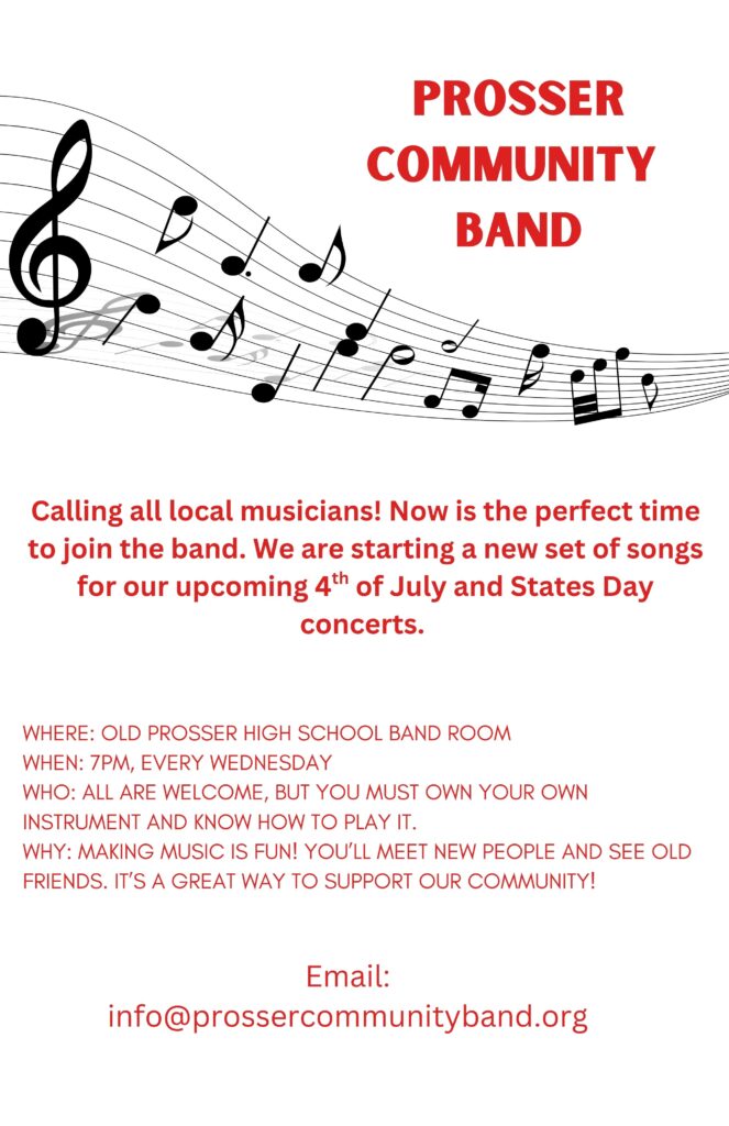 Contact Information: For more details, email Carol at info@prossercommunityband.org. She is our point of contact and will be more than happy to assist you.